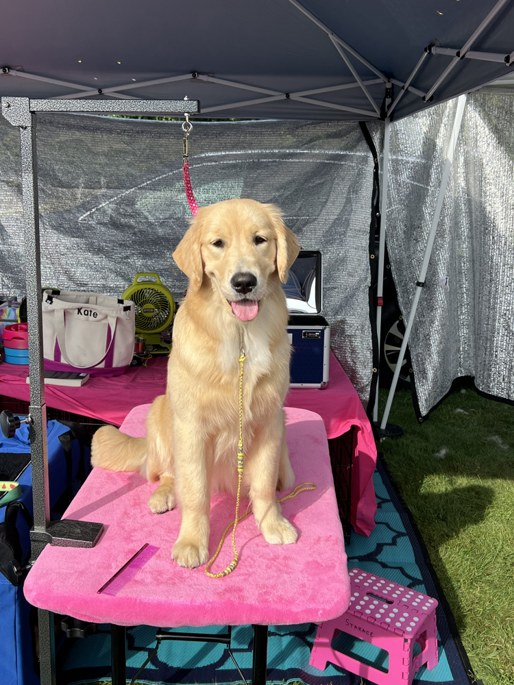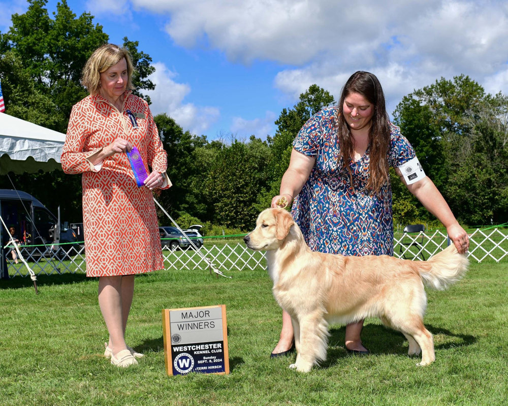 Pippa is following in her father Gunner’s footsteps in the conformation ring and what an incredible start she’s had! At her very first show, Pippa went Best of Breed in the 4 – 6 month puppy class. Then, at just 6 months old she went Winner’s Bitch, for a 4 point major from the 6 – 9 month puppy class at the Westchester Kennel Club! Pippa has earned both her AKC Star Puppy and Puppy of Achievement titles. Pippa earned both her Beginner Novice in obedience and her Rally Novice titles in 2025. A true golden, she loves anything water related and we expect she will excel in dock diving this summer.